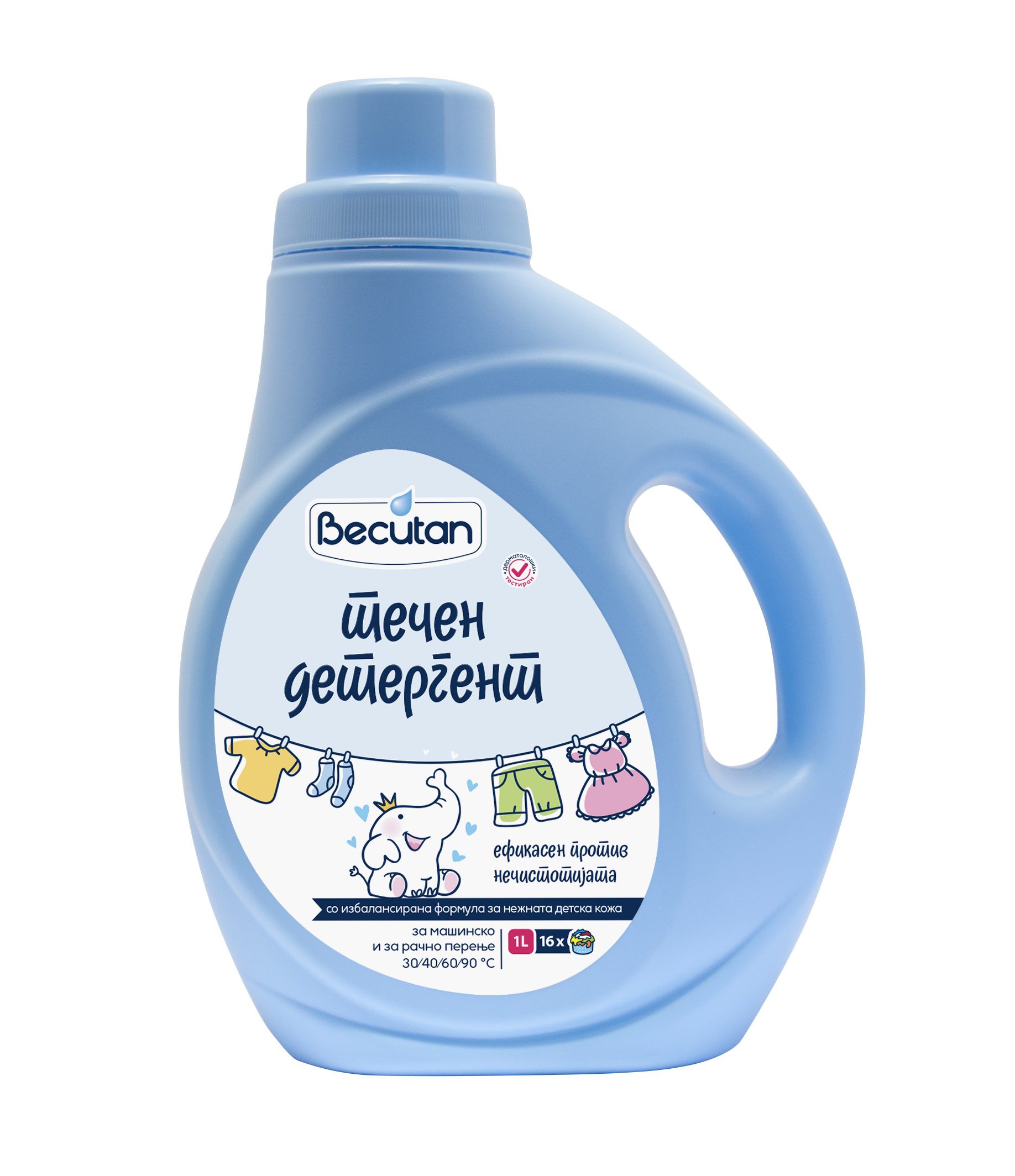 Новиот течен детергент Бекутан е ефикасен против нечистотијата, а неговата блага формулација збогатена со ензими, која ги отстранува дамките од облеката, истовремено е нежна за детската кожа. Детергентот е наменет за перење на температура од 30 до 90°C и претставува одличен избор за чист и безбеден резултат. Збогатената формулација со ензими ефикасно ги отстранува дамките од облеката, притоа задржувајќи го препознатливиот мирис на Бекутан. Содржината од 1l е наменета за 16 перења и прилагодена кон нежната детска кожа, што е потврдено со дерматолошки тестови.